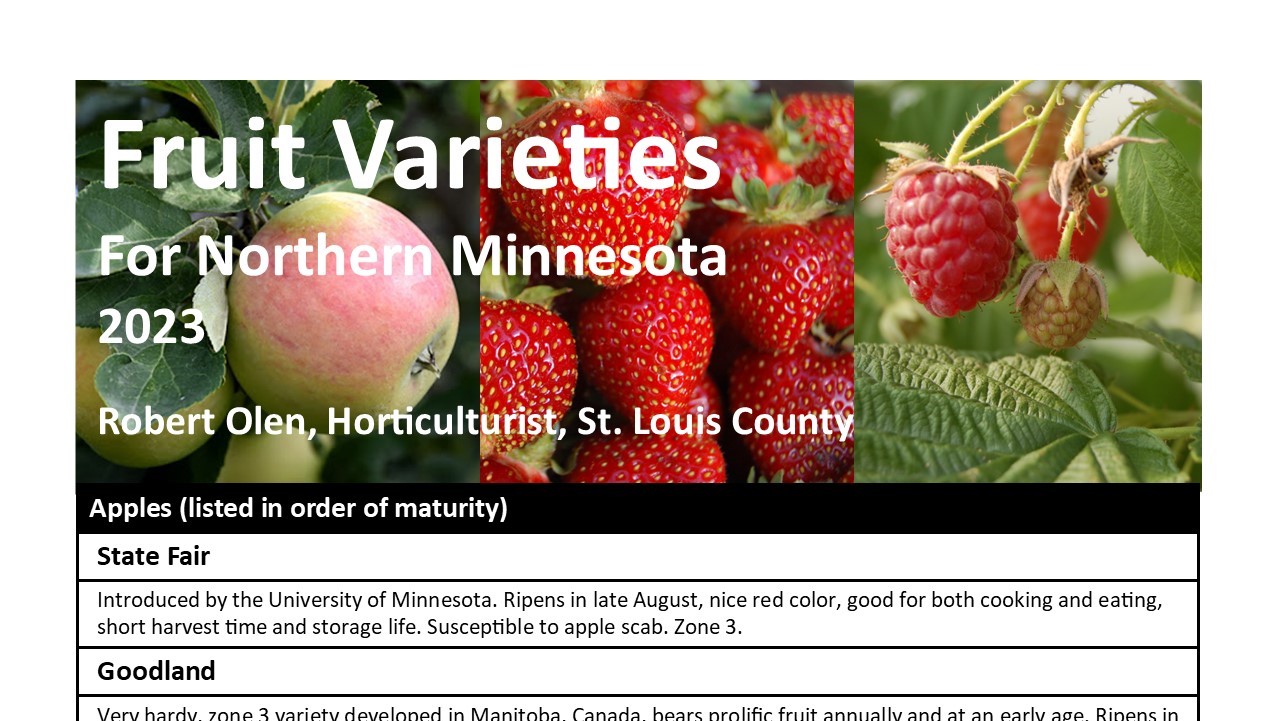 Wondering what grows best in the Northland? Check out the newly updated Fruit Varieties for Northern Minnesota and Vegetable Varieties for Northern Minnesota publications available now at our Extension Offices in Duluth and Virginia. Recommendations for varieties are based on varietal trials happening throughout our county. Lists are updated each year.